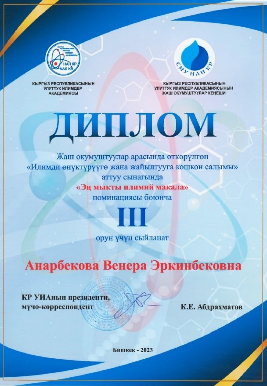10 ноября 2023 г. ко Дня науки в конкурсе среди молодых ученых «Вклад в развитие и распространение науки», объявленном Советом молодых ученых Национальной академии наук Кыргызской Республики в номинации «Лучшая научная статья», доцент Анарбекова Венера Эркинбековна награждена ДИПЛОМОМ за III место.