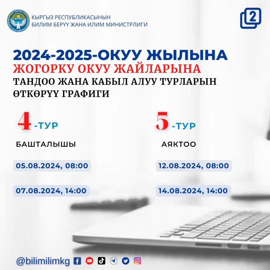 Отбор и зачисление абитуриентов в высшие учебные заведения Кыргызской Республики по итогам общереспубликанского тестирования на 2024-2025 учебный год будет проведено в 5 туров.